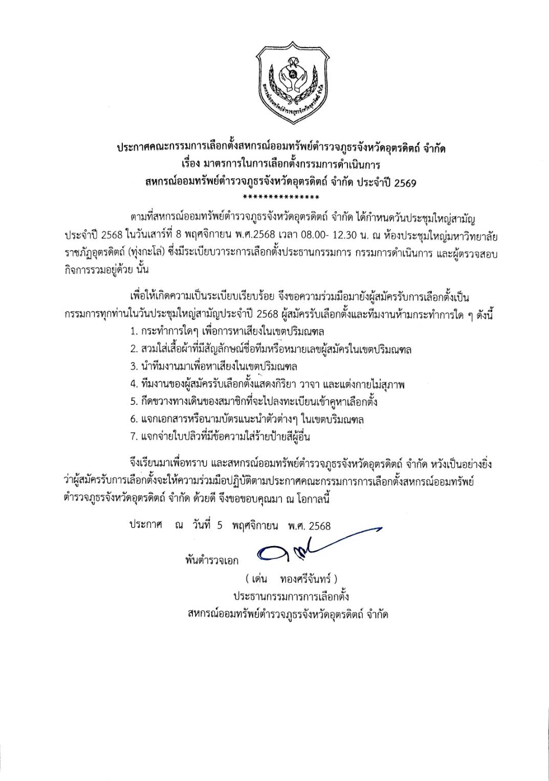 ประกาศ จัดจ้างก่อสร้างอาคารสำนักงานสหกรณ์ออมทรัพย์ตำรวจภูธรจังหวดัอุตรดิตถ์ จำกัด เนื่องด้วยสหกรณ์ออมทรัพย์ตำรวจภูธรจังหวัดอุตรดิตถ์ จำกัด จะดำเนินการก่อสร้างอาคารสำนักงานคอนกรีตเสริมเหล็ก 2 ชั้น บนโแนดที่ดินเลขที่ 7881 หมู่ที่ 5 ตำบลท่าเสา อำเภอเมือง จังหวัดอุตรดิตถ์ ทางหลวงชนบทหมายเลข 1047 (กม.ที่ 0+550) บ้านม่อนดินแดง (อต4007) จึงขอประกาศและประชาสัมพันธ์ให้กับผู้รับจ้าง เพื่อดำเนินการจัดจ้างต่อไป กำหนดซื้อเอกสารประกวดราคา ซองละ 5,000 บาท ตั้งแต่วันที่ 1 กันยายน 2568 ถึง 30 กันยายน 2568 เวลา 8:30 น ถึง 16:30 น เว้นวันหยุดราชการ ณ สำนักงานสหกรณ์ออมทรัพย์ตำรวจภูธรจังหวัดอุตรดิตถ์ จำกัด เลขที่ 33/33-34 ถนนพาดวารี ตำบลท่าอิฐ อำเภอเมือง จังหวัดอุตรดิตถ์ โทร 055-409-902 และ 083-023-7170 เกณฑ์การพิจารณาผลการยื่นข้อเสนอครั้งนี้ จะพิจารณาตัดสินโดยใช้หลักเกณฑ์ราคากำหนดยื่นข้อเสนอ โดยกำหนดการเปิดซองประกวดราคาและพิจารณาผลการยื่นเสนอราคาในวันที่ 16 ตุลาคม 2568 รับซองประกวดราคา วันที่ 16 ตุลาคม 2568 ตั้งแต่เวลา 09:00 - 12:00 น เปิดซองประกวดราคาและพิจารณาผลการยื่นเสนอราคา วันที่ 16 ตุลาคม 2568 ตั้งแต่เวลา 13:00 น เป็นต้นไป โดยจะเปิดซองเอกสารหลักฐานของผู้เสนอราคา "บัญชีเอกสารส่วนที่ 1, บัญชีเอกสารส่วนที่ 2 และใบเสนอราคา" ตามลำดับ ทั้งนี้ รายละเอียดพัสดุและการยื่นข้อเสนอปรากฏตามสิ่งที่ส่งมาด้วย