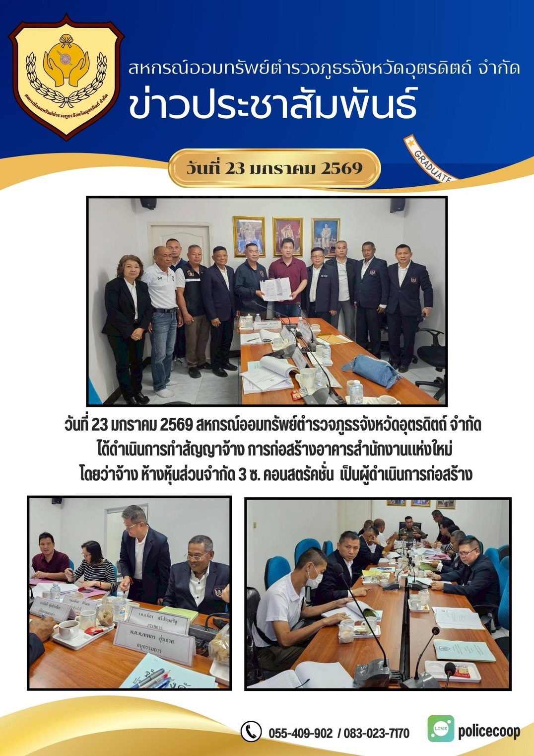 วันที่ 23 มกราคม 2569 สหกรณ์ออมทรัพย์ตำรวจภูธรจังหวัดอุตรดิตถ์ จำกัด ได้ดำเนินการทำสัญญาจ้างการก่อสร้างอาคารสำนักงานแห่งใหม่ โดยว่าจ้าง ห้างหุ้นส่วนจำกัด 3 ซ. คอนสตรัคชั่น เป็นผู้ดำเนินก่อสร้าง